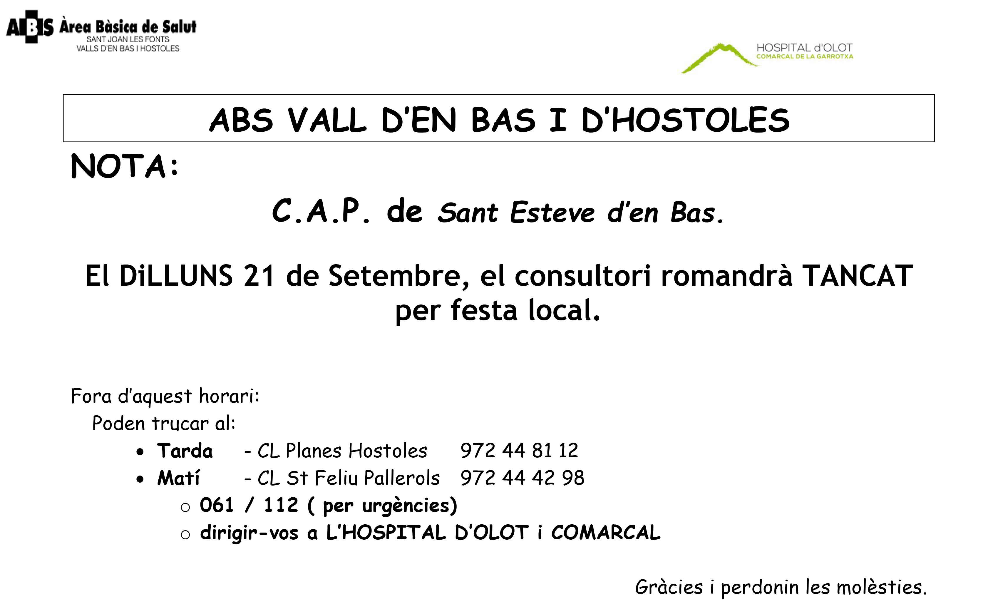 01/12/2025Segons l’últim informe elaborat per l’Agència de Qualitat i Avaluació Sanitàries de Catalunya (AQuAS), l’Àrea Bàsica de Salut (ABS) Vall d’en Bas–Hostoles se situa al capdavant del rànquing català de bones pràctiques en atenció primària. L’estudi analitza diversos indicadors relacionats amb la qualitat assistencial, l’accessibilitat als serveis, la resolució, la seguretat i la satisfacció de […]