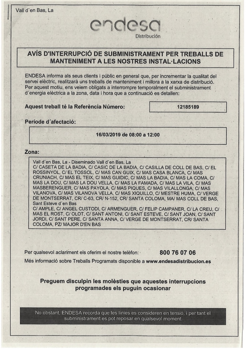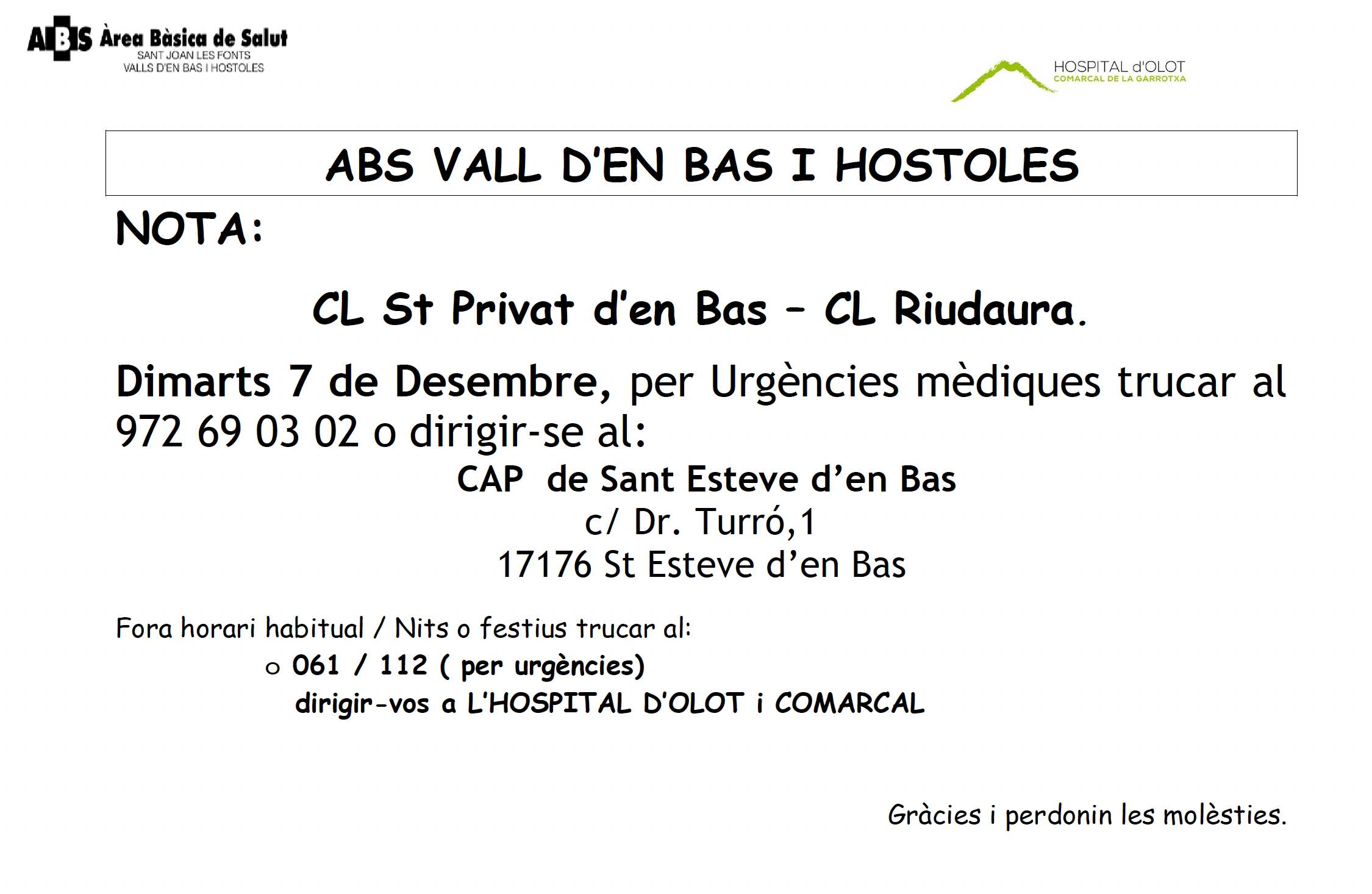 05/12/2025L’Ajuntament de la Vall d’en Bas informa que avui s’ha publicat al Diari Oficial de la Generalitat (DOGC) l’edicte mitjançant el qual les persones no notificades i afectades pel projecte de la Variant de les Preses i d’Olot que no han estat notificades poden consultar el llistat amb els noms i DNI per tal de […]
