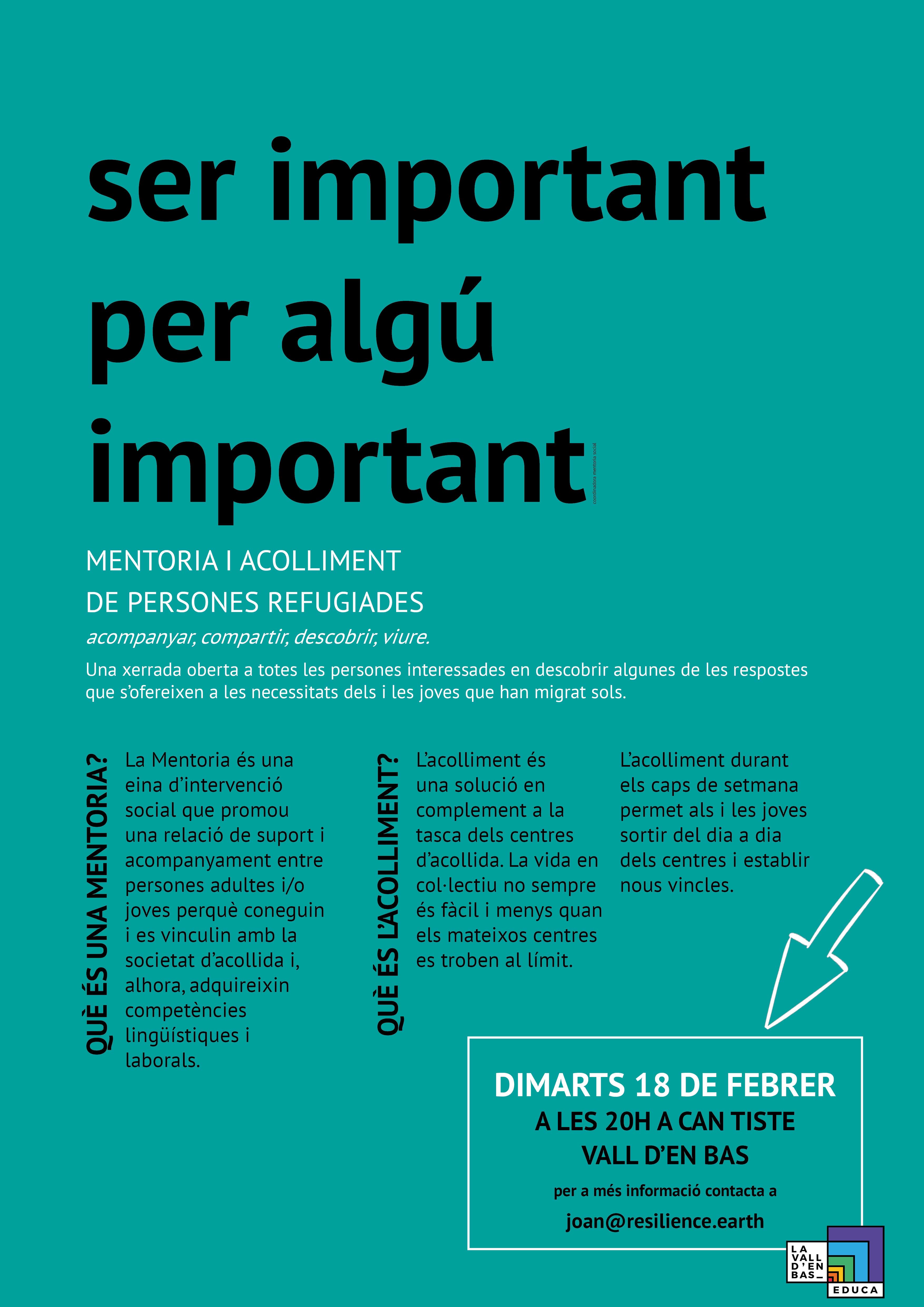 Aquest dimarts dia 18 de febrer a les 20h al local de Can Tista (Telecentre) tindrà lloc una trobada per explicar als veïns i veïnes de La Vall d’en Bas el projecte de mentoria i acolliment de persones refugiades i joves que migren sols. No us ho perdeu!