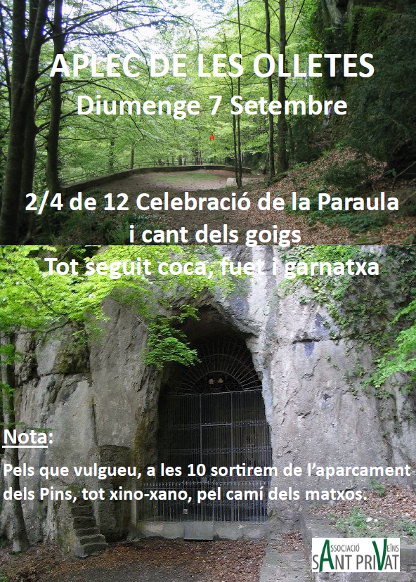 A Sant Privat, se sortirà a les 10:00 h de l’aparcament dels Pins i es pujarà a peu pel Camí dels Matxos. A 2/4 de 12, Celebració de la Paraula i cant dels Goigs. Tot seguit, coca, fuet i garnatxa.