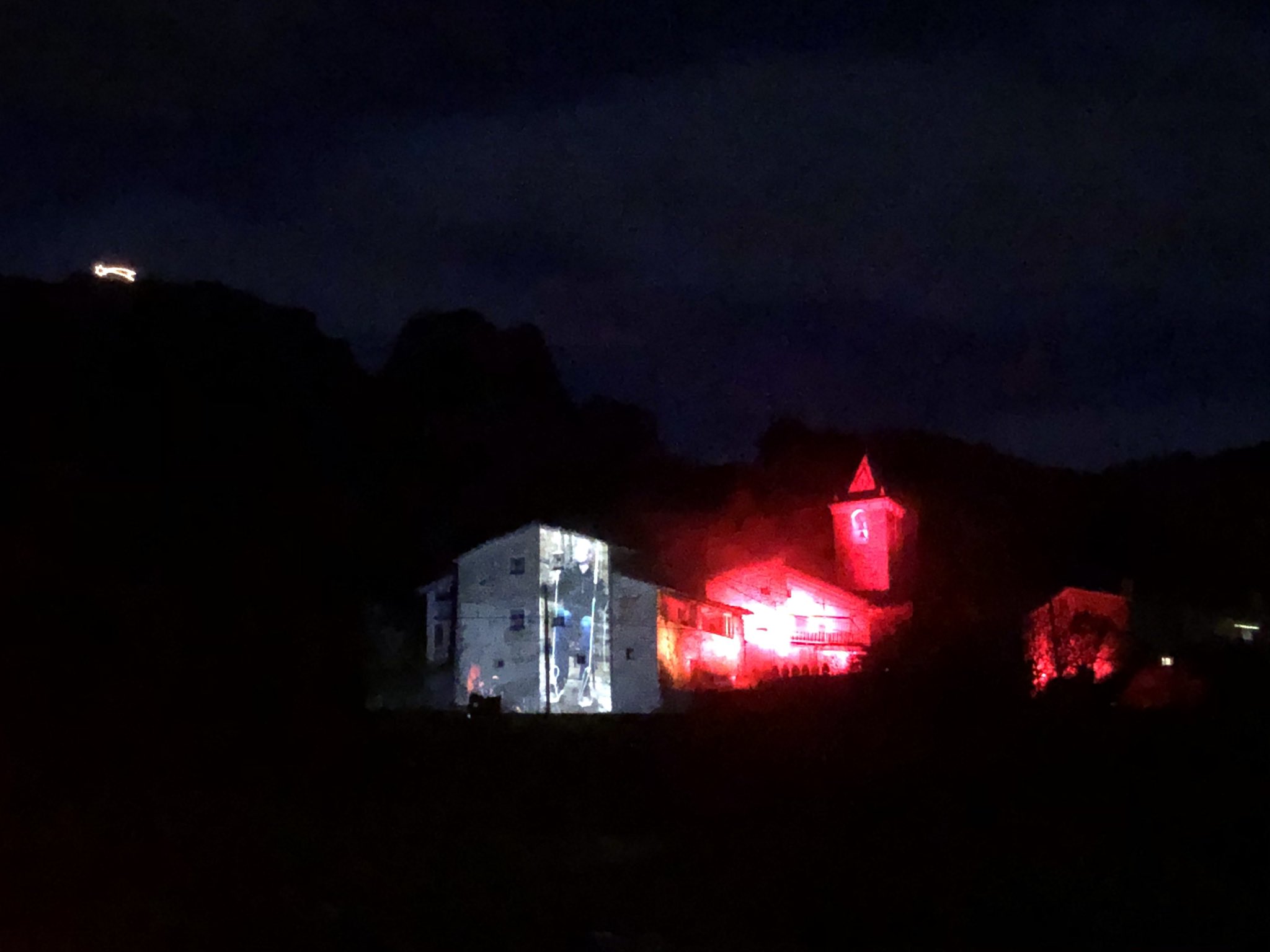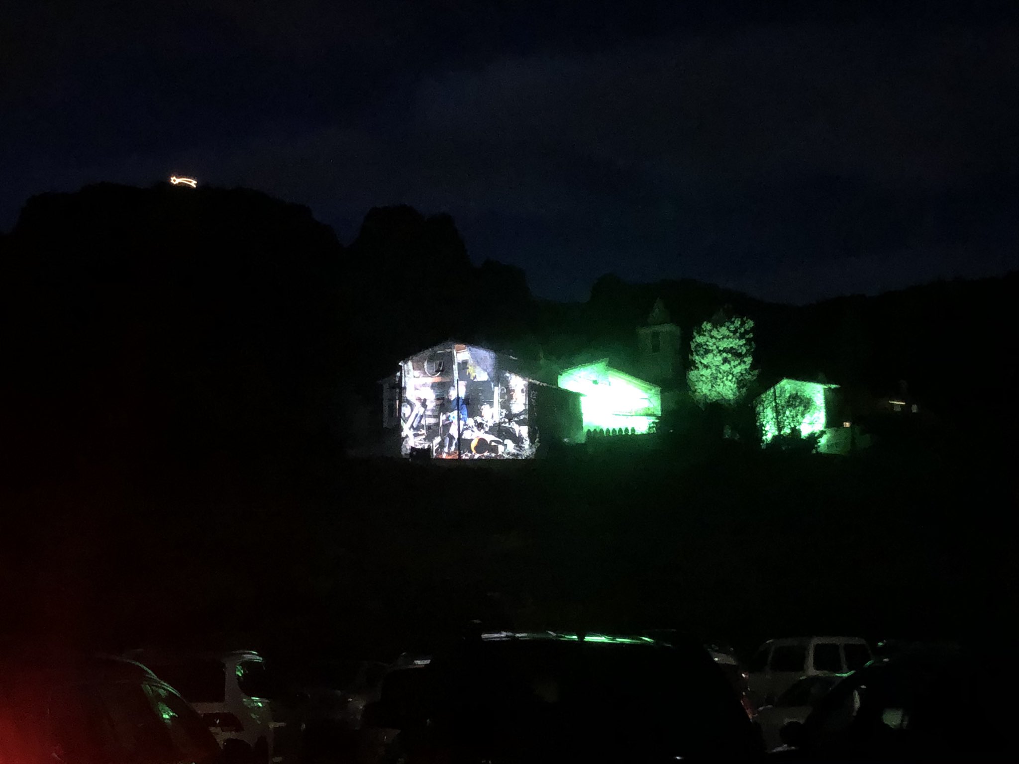 Una bona colla de vehicles s’han concentrat a Joanetes per veure com es projectaven imatges d’edicions anteriors a les parets d’un edifici. Per la ràdio s’han pogut seguir tocs, vols i repics de campanes per acompanyar el seguiment.