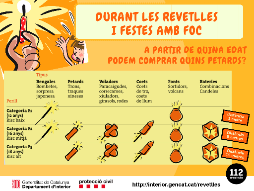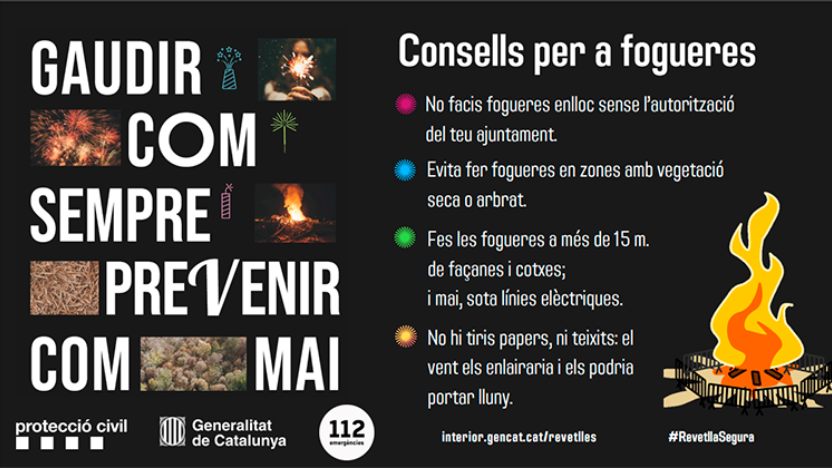 El Departament d’Interior de la Generalitat de Catalunya ens informa dels consells de protecció civil per ajudar a minimitzar els riscos que comporta l’ús material pirotècnic i l’encesa de fogueres. Riscos davant dels quals són vulnerables tant les persones com el medi natural.