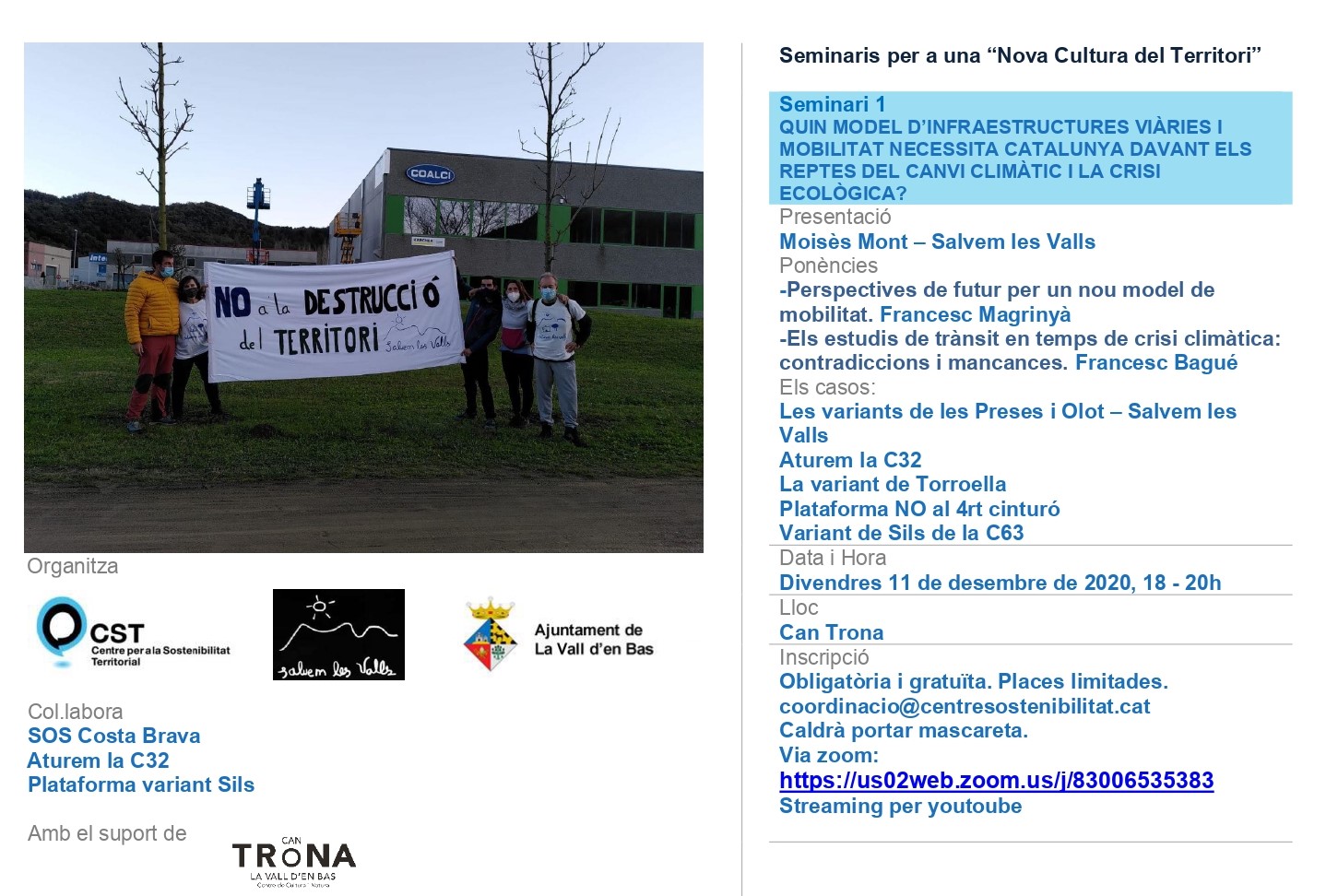 El primer seminari és aquest divendres 11 de desembre de 6 de la tarda a 8 del vespre i porta per títol ‘Quin model d’infraestructures viaries i mobilitat necessita Catalunya davant els reptes del canvi climàtic i la crisi ecològica?’. La presentació del seminari anirà a càrrec de Moisès Pont de la plataforma Salvem les Valls i comptarà amb dues ponències.