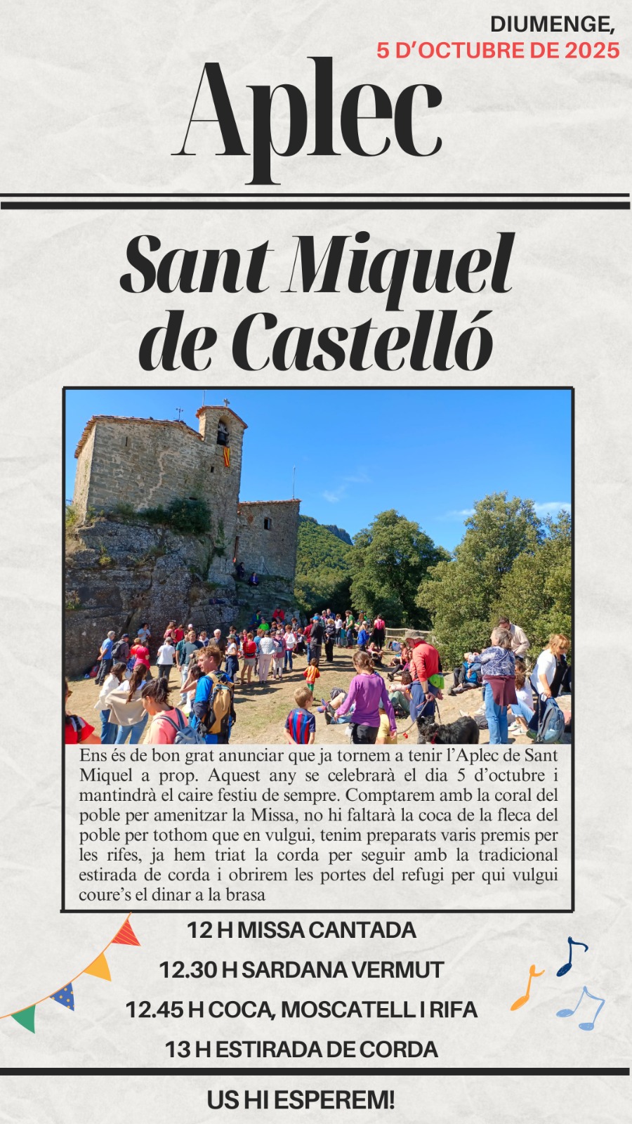 El pròxim diumenge 5 d’octubre de 2025 la Vall d’en Bas viurà una jornada plena de tradicions, cultura i música. Dos esdeveniments destacats ompliran el dia de vida i germanor: l’Aplec de Sant Miquel de Castelló i el Concert Vermut amb Swing Engine Street Sextet. Aplec de Sant Miquel de Castelló Programa del dia 12:00 […]