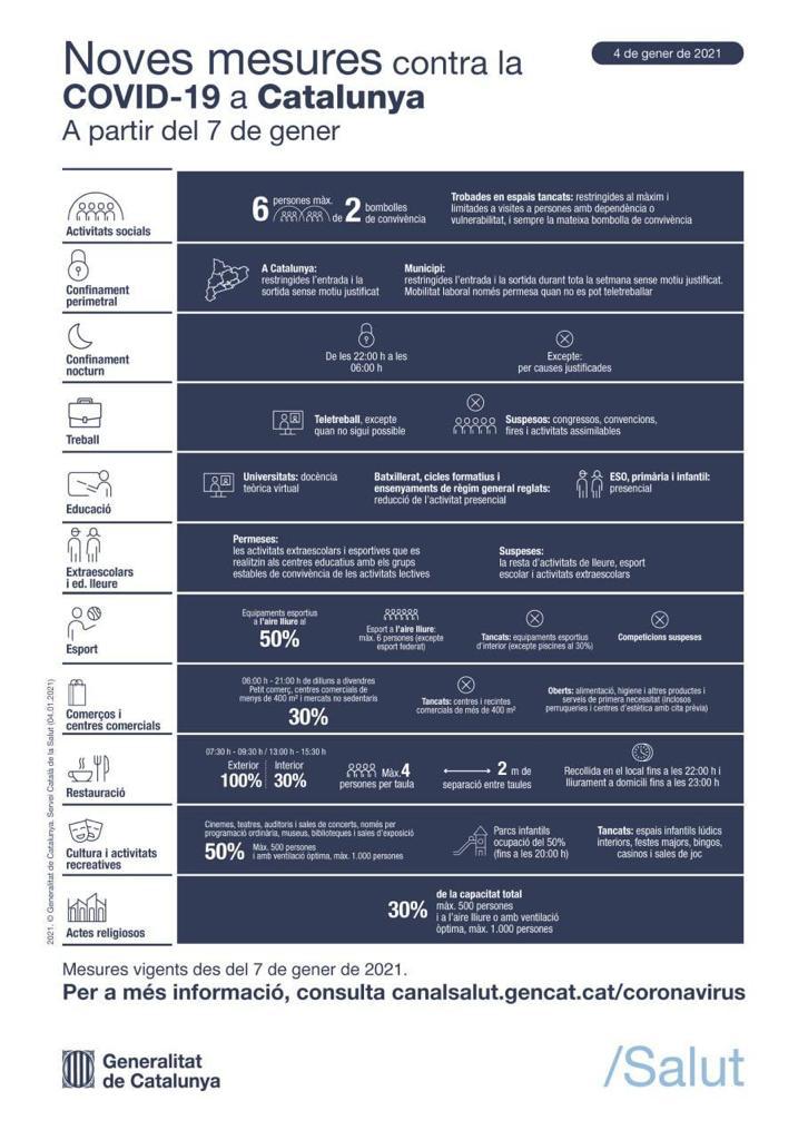 El Procicat ha anunciat una sèrie de mesures que seran vigents a tota Catalunya a partir d’aquest dijous 7 de gener. Aquestes mesures s’allargaran 10 dies per intentar reduir la propagació dels contagis.