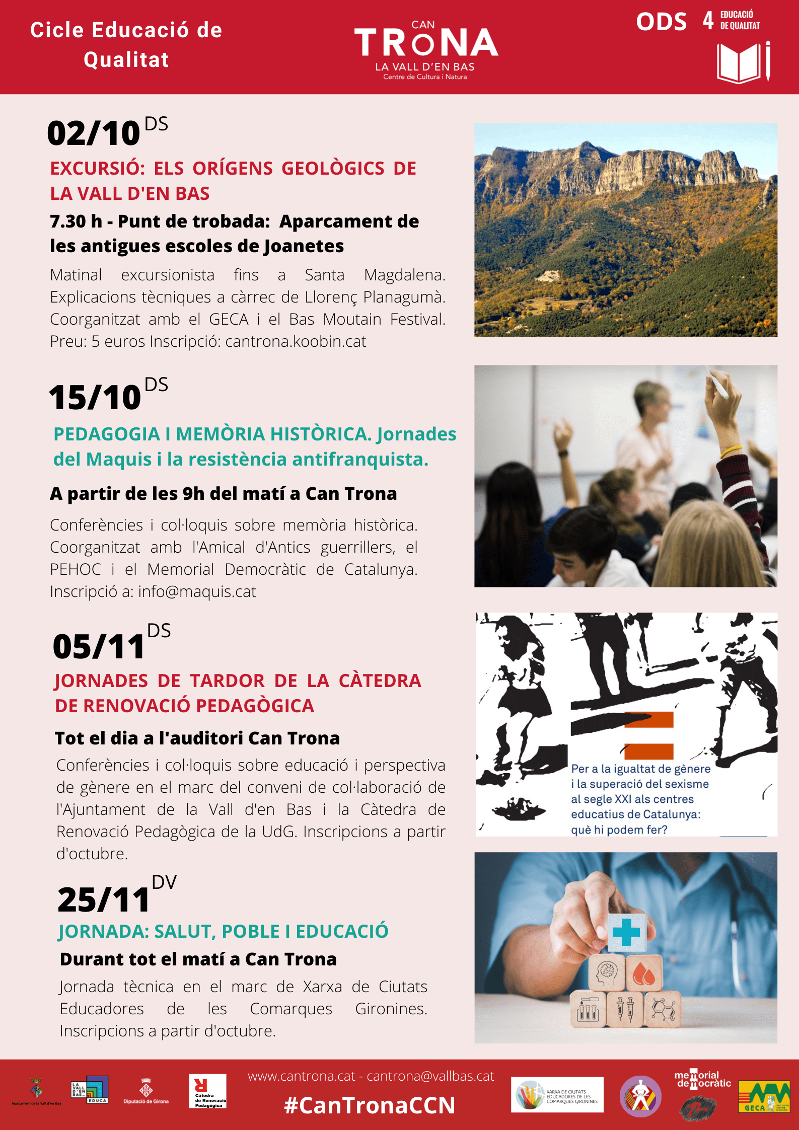A més de l’excursió, cal destacar tres activitats educatives més que tindran lloc aquesta tardor. En primer lloc, la jornada “Pedagogia i Memòria. Els maquis i la resistència antifranquista” organitzada el 15 d’octubre entre l’Ajuntament, l’Amical d’Antics Guerrillers, el PEHOC i el Memorial Democràtic de Catalunya. En segon lloc, les Jornades de Tardor de la Càtedra de Renovació Pedagògica Can Trona- UDG, que se celebraran el 5 de novembre i tractaran sobre la igualtat de gènere. I finalment la jornada “Salut, poble i educació” organitzada el 25 de novembre en el marc de Xarxa de Ciutats Educadores de les Comarques Gironines. Les inscripcions a aquestes dues darreres activitats es podran fer a partir d’octubre.