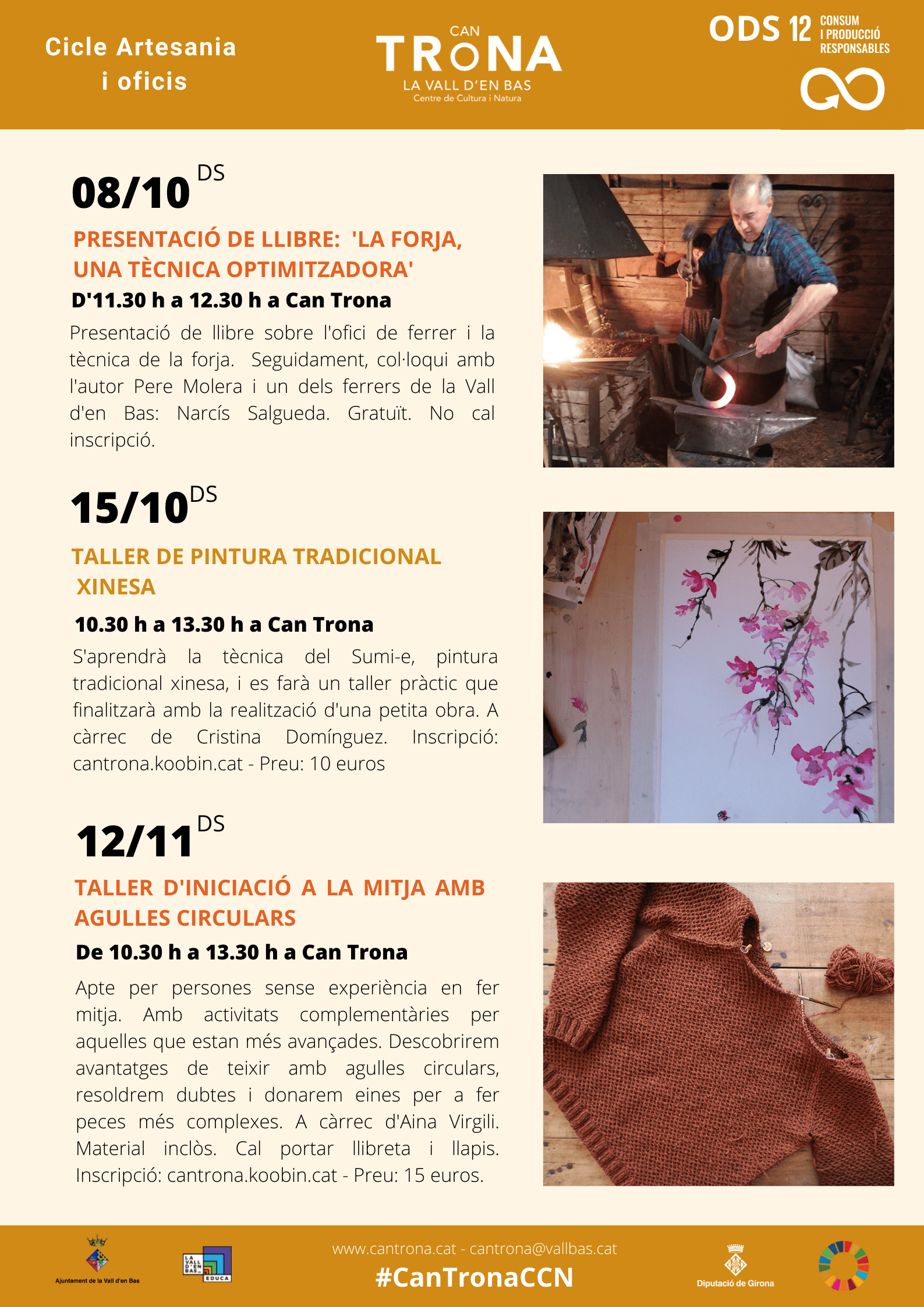 El tercer cicle té l’artesania i els oficis com a eixos vertebradors. Començarà el 8 d’octubre amb una xerrada gratuïta sobre l’ofici de la forja amb presència de Pere Molera i Narcís Salgueda, un dels ferrers amb més tradició de la Vall d’en Bas. Seguidament, el 15 d’octubre a les 10.30h, tindrà lloc un taller de pintura tradicional xinesa a càrrec de Cristina Domínguez. El Sumi-e és la pintura tradicional xinesa que va derivar de la cal.ligrafia en el segle IX, es basa en l’observació de la natura i el traç únic. Els participants treballaran amb materials originals: tinta xinesa orgànica, suzuri, pinzells de pèl natural i paper d’arròs o seda. Preu: 10 euros. Inscripcions: cantrona.koobin.cat