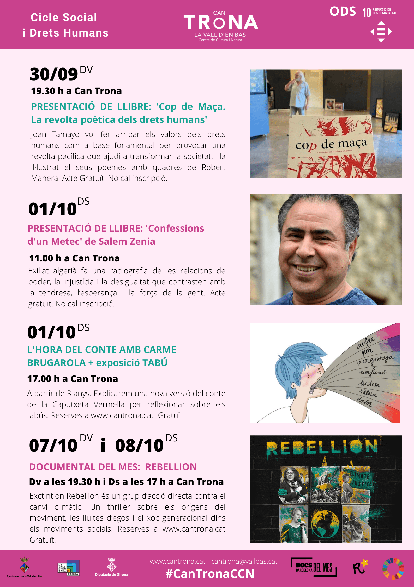En el primer cicle s’han volgut abordar les temàtiques socials referents als Drets Humans. El dia 30 de setembre a les 19.30 h a Can Trona es presentarà el llibre “Cop de maça. La revolta poètica dels drets humans” de l’advocat i activista Joan Tamayo amb il·lustracions de Robert Manera. Seguint amb aquesta temàtica social, el dia 1 d’octubre a les 11 h. tindrà lloc la presentació de llibre “Confessions d’un metec” de Salem Zenia, exiliat algerià que farà una radiografia de les relacions de poder, injustícia i desigualtat que contrasten amb la tendresa, l’esperança i la força de la gent. Així mateix, s’ha organitzat una activitat destinada a públic familiar per abordar els drets dels infants. Es tracta de l’hora del conte amb Carme Brugarola, que tindrà lloc el dia 1 d’octubre a les 17 h. S’explicarà el conte “Que la força ens acompanyi” una nova versió del conte de la caputxeta vermella per a reflexionar sobre els tabús. A més, qui vingui a escoltar el conte també es podrà veure l’exposició “Tabú”, que parla sobre el món de la sexualitat i les emocions a la infància. Ambdues activitats estan produïdes des de l’associació Reach Protectin Children. Totes aquetes activitats són gratuïtes, per les dues primeres no cal inscripció. Per venir a veure el conte us podeu apuntar a www.cantrona.cat perquè l’aforament és limitat. Finalment, també cal destacar el documental del mes d’octubre, que tracta sobre la lluita contra l’emergència climàtica.