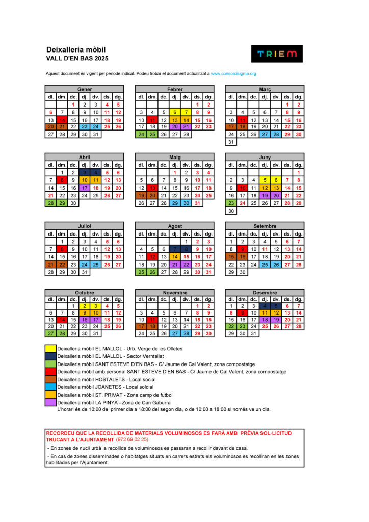 Deixalleria mòbil: Un cop al mes, el municipi disposa d’un servei de deixalleria mòbil on es poden dipositar residus especials com ordinadors, petits electrodomèstics, tòners, fluorescents, piles, olis, etc. La trobareu cada mes en un poble diferent.Podeu consultar el calendari a continuació: