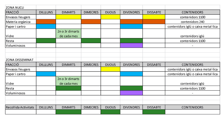 Recollida de residus domèstics: Contenidors del municipi. Podeu consultar el calendari a continuació: