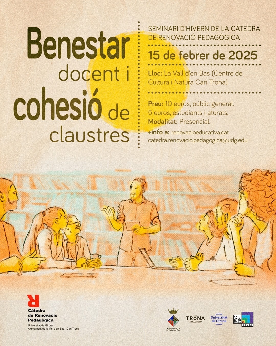 Aquest dissabte arriba la Jornada pel Seminari d’Hivern de la Càtedra de Renovació Pedagògica, un espai de seminaris i xerrades on diferents professionals de l’àmbit compartiran la seva experiència i reflexió sobre bones pràctiques educatives per treballar i aprofundir en el benestar docent i com potenciar la cohesió de claustres