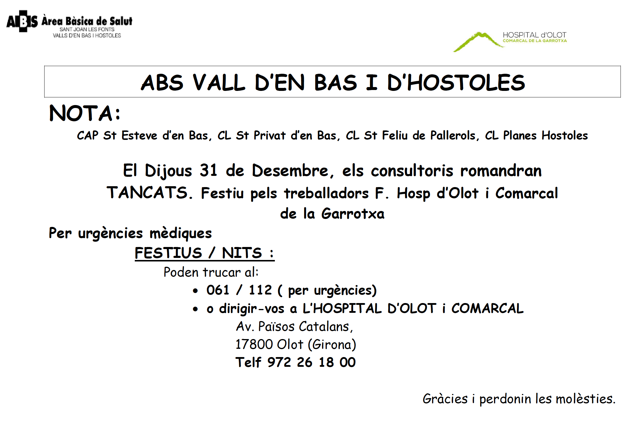 El proper dia 31 de desembre els consultoris romandran tancats per festiu dels treballadors de la Fundació que gestiona els serveis. Per això no estaran oberts ni el CAP de Sant Esteve d’en Bas ni el consultori local de Sant Privat d’en Bas.
