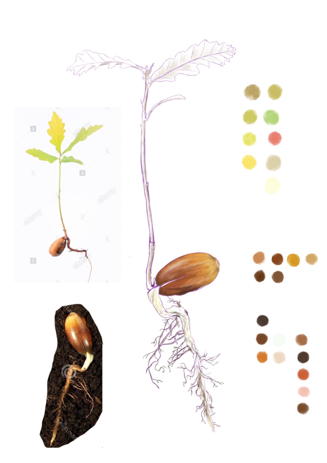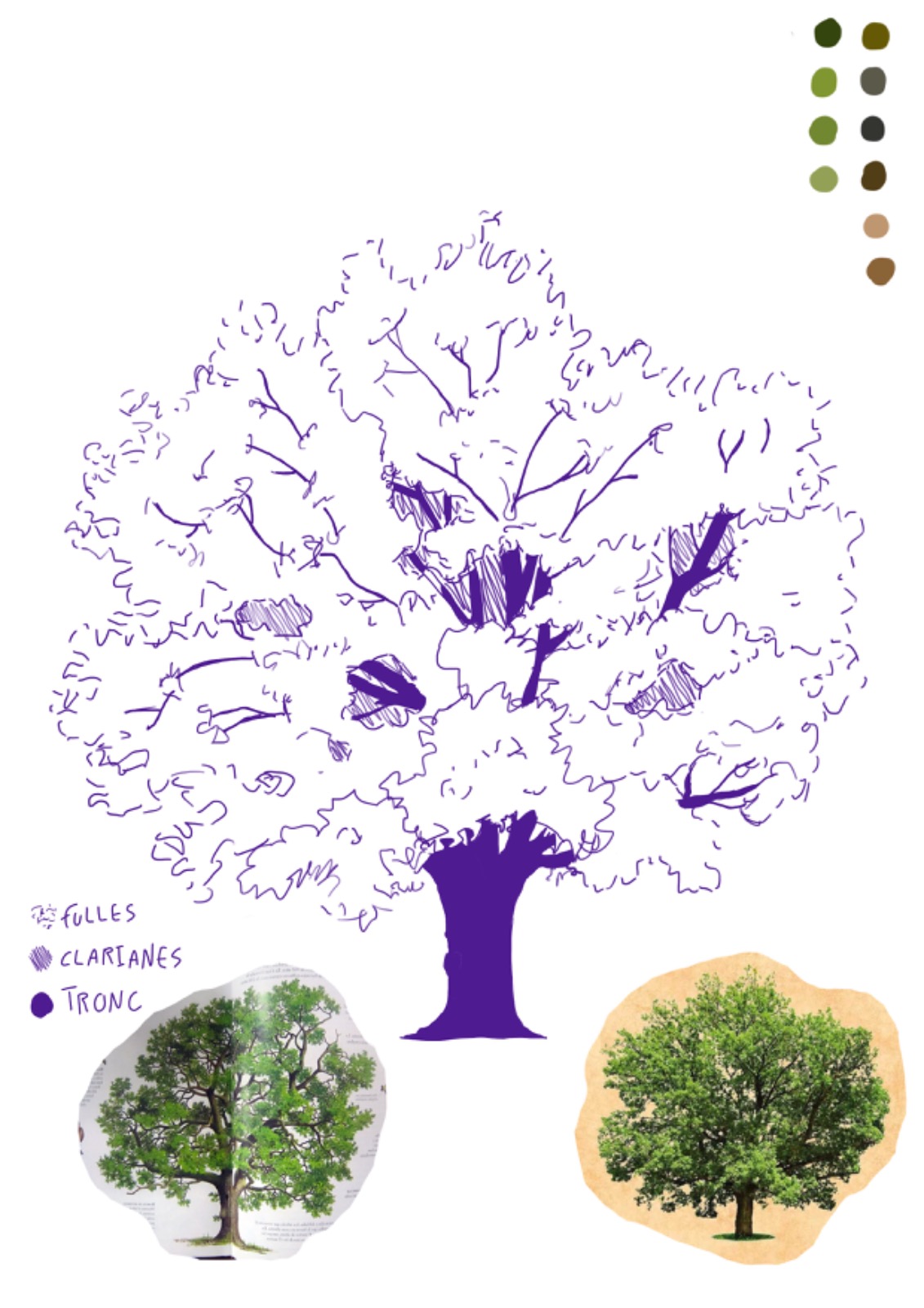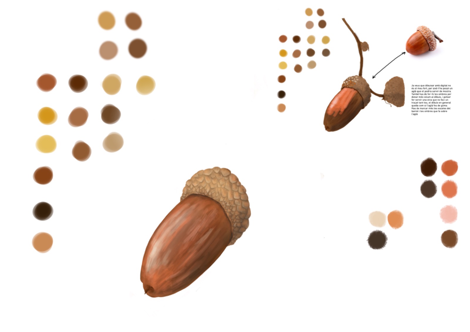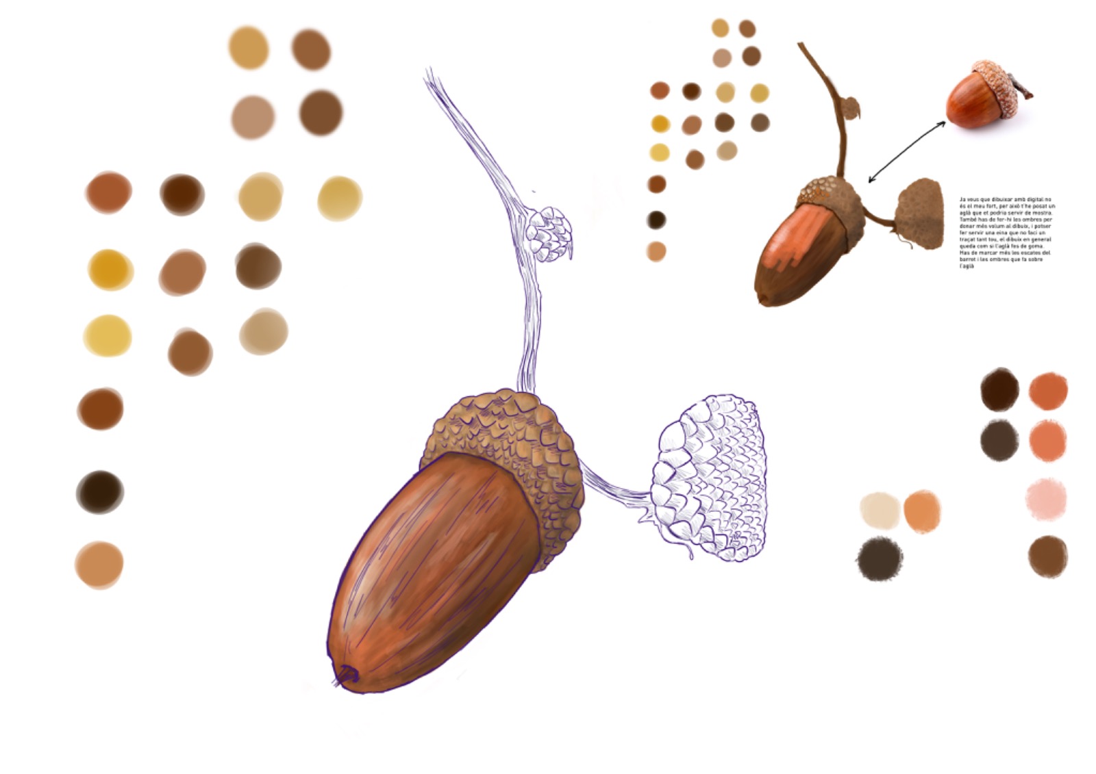 El segon projecte de les pràctiques del postgrau d’Il·lustració Científica a la Vall el signa la estudiant Mireia Quintana, que ens explica que depenent de la dificultat del dibuix triga més o menys temps a completar-lo. Per exemple, en el cas de l’arbre, un roure, la suma total d’hores va ser d’unes 15 aproximadament. En canvi, la gla, el fet de ser un dibuix aïllat i no part d’un conjunt, li va suposar unes 10 hores de feina.